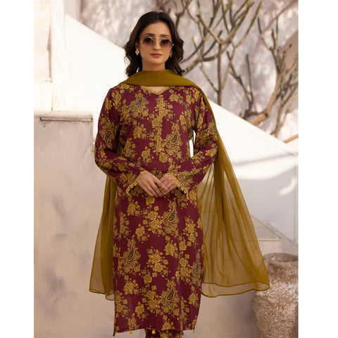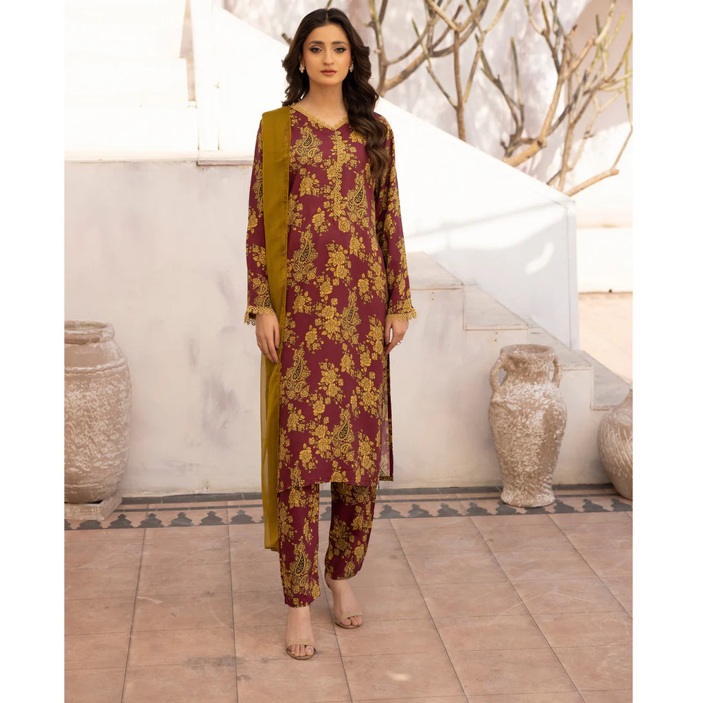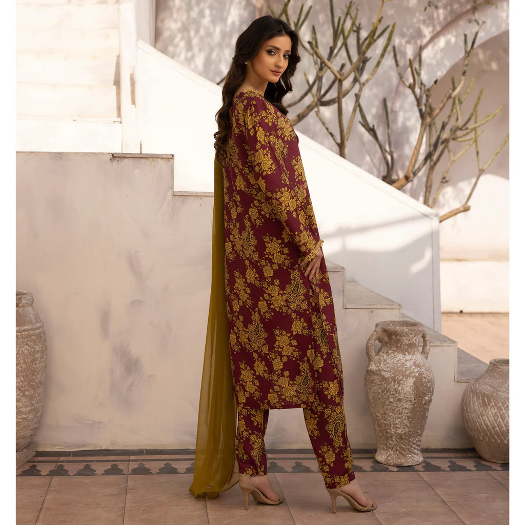 Maroon printed linen with mustard floral prints. V neckline with mustard lace embroidery piping. Lace piping on cuffs of sleeve. Paired with printed trousers. Finished with a mustard chiffon dupatta.