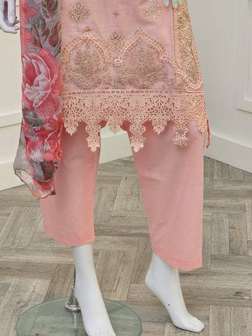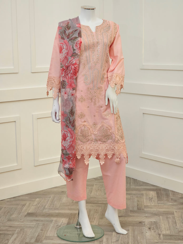 Baby pink cotton embroidery suit. Round neckline with paisley, with silver thread embroidery. Accented with mirror designs. Side panel of kameez with gold sequence thread embroidery. Baby pink lace embroidery on cuff of sleeves. Border lace on the bottom of kameez. Paired with plain cotton trousers. Digital printed pink and grey chiffon dupatta
