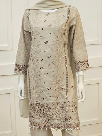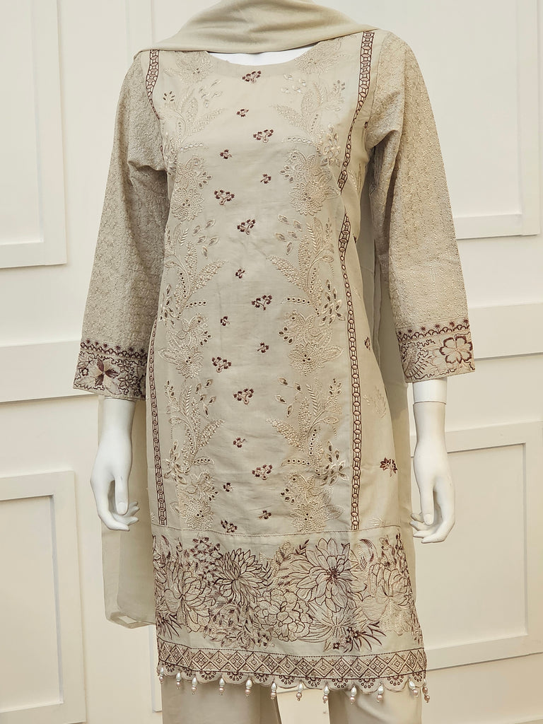 Beige with chicken kari embroidery, contrasted with maroon thread floral designs. Cuff embroidery in maroon and border of kameez. Finished with pearl piping on the bottom of. kameez. Paired with trousers with maroon cuff embroidery. Finished with silk chiffon dupatta in beige.