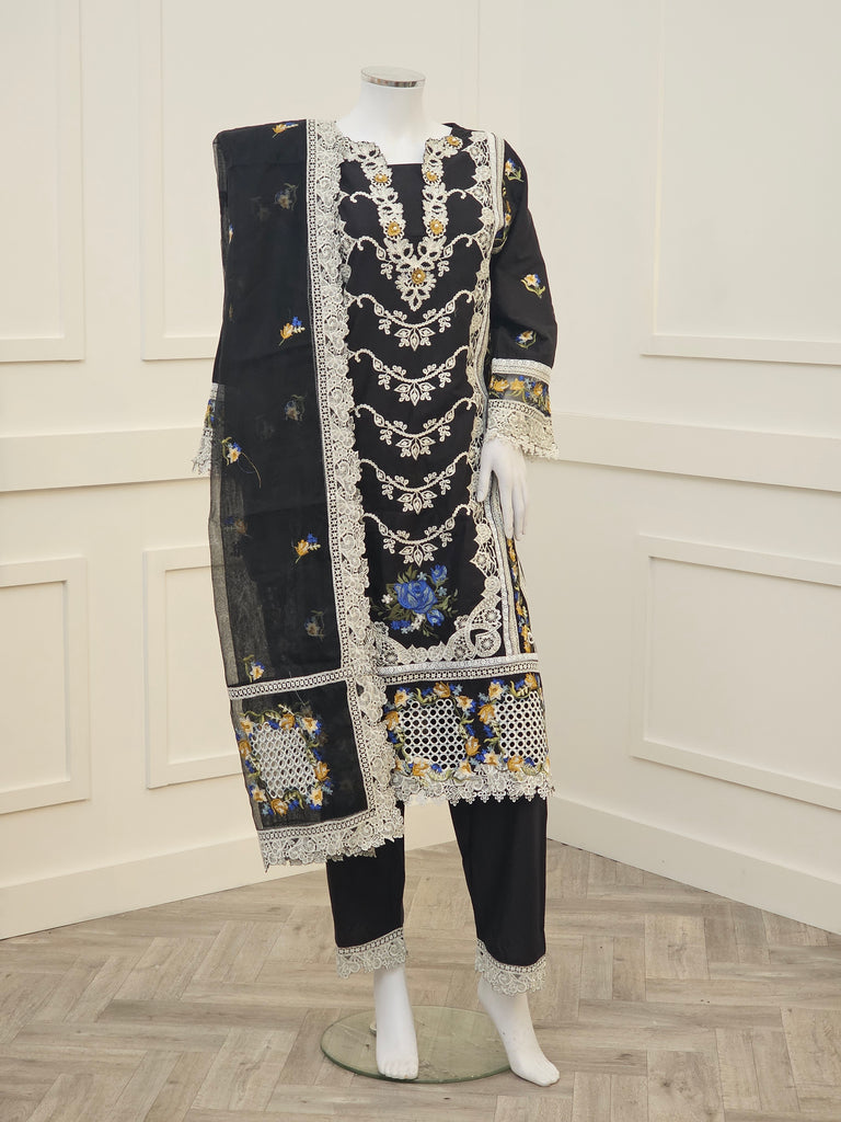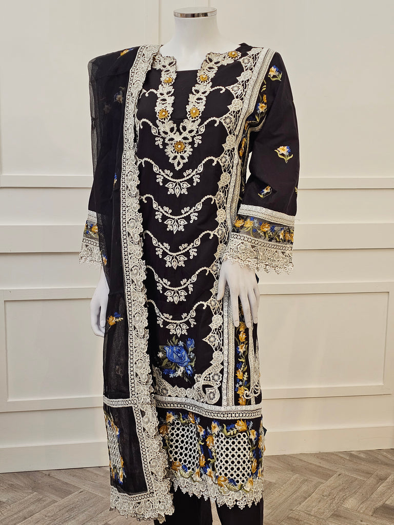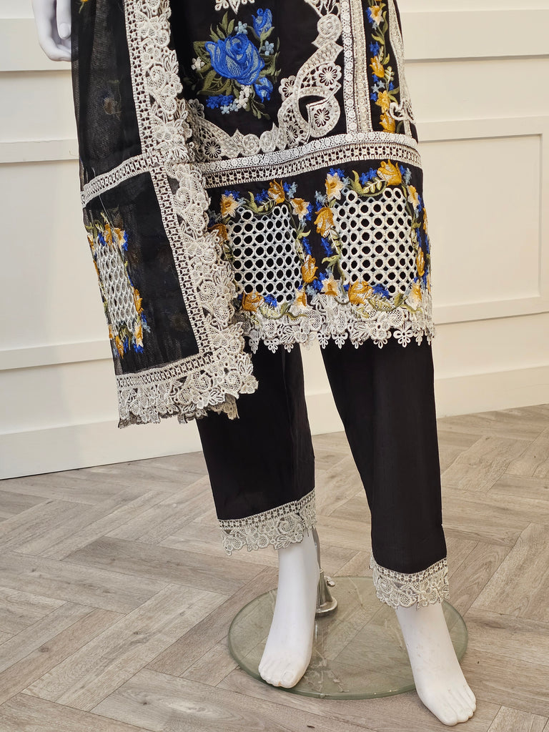 Black cotton with white floral thread embroidery throughout. Accents with yellow and blue floral thread embroidery. Round neckline. White lace embroidery on the border of kameez, finished with lace piping. Embroidery on sleeves and cuff lace embroidery. Paired with black trousers with white lace piping. Khaddi net dupatta with white lace piping and border embroidery.