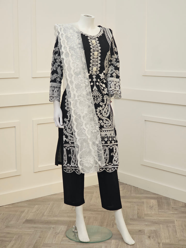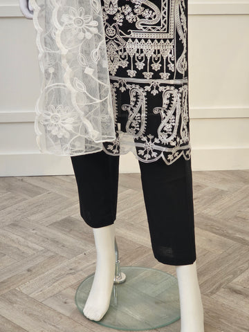 Black with White cotton kameez, with white floral and paisley thread embroidery.  Round neckline with cluster pearl floral design. Lace white cuff embroidery on sleeve. Paired with plain black cotton trousers. White net dupatta with white thread embroidery. Scallop embroidery on the border of kameez.