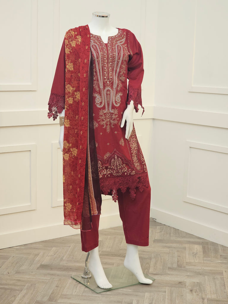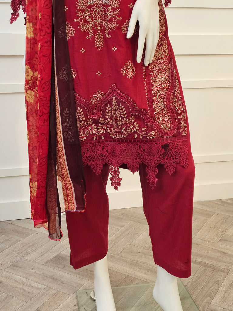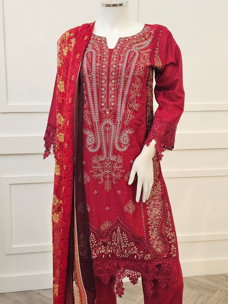 Cherry red cotton embroidery suit. Round neckline with paisley, with silver thread embroidery. Accented with mirror designs. Side panel of kameez with gold sequence thread embroidery. Cherry red lace embroidery on cuff of sleeves. Border lace on the bottom of kameez. Paired with plain cotton trousers. Digital printed chiffon dupatta with gold prints.