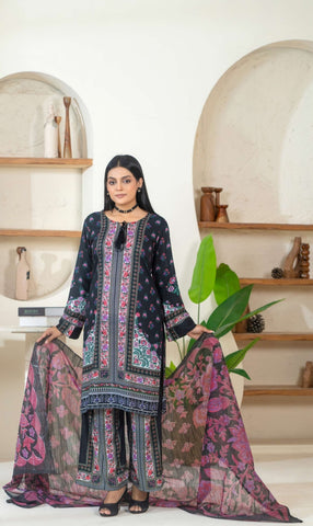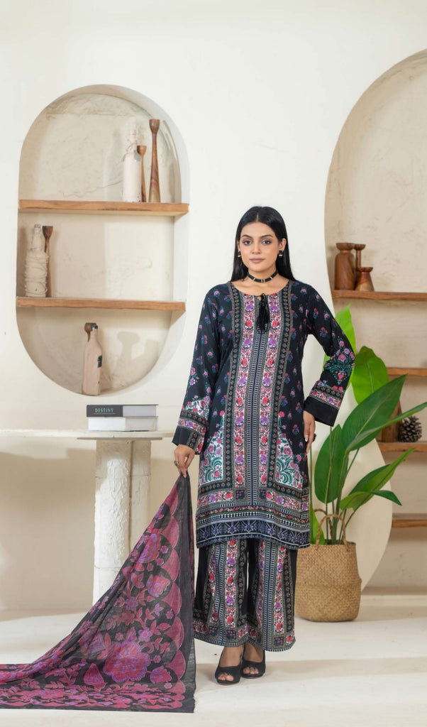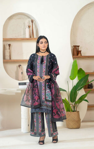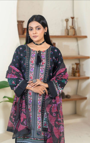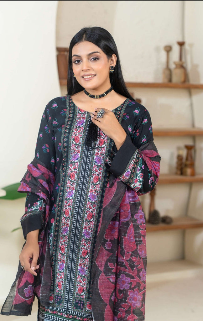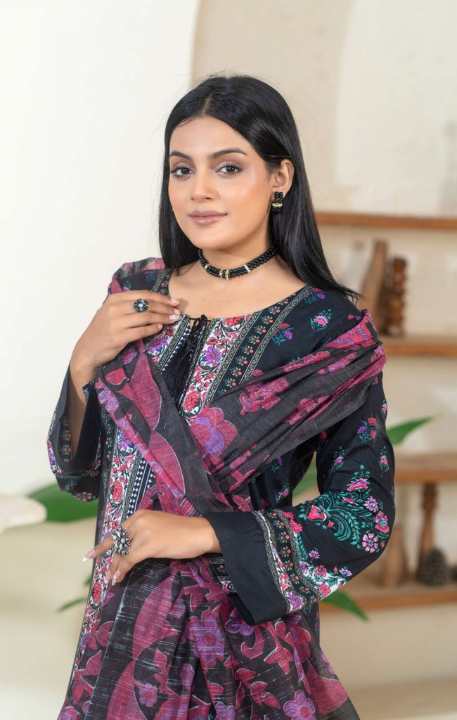 Black linen, with digital floral prints. Accented with pink, purple and turquoise throughout kameez. Round neckline with tie tassel with black. Paired with leg printed trousers. Printed black and pink floral chiffon dupatta.
