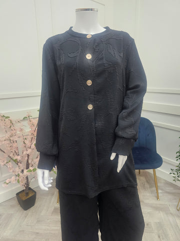 2PC CORD Modestwear. Freesize in Mocha rayon embroidery design throughout shirt and trousers. Round neckline with gold buttons, with cuff sleeves. Paired with wide leg trousers.