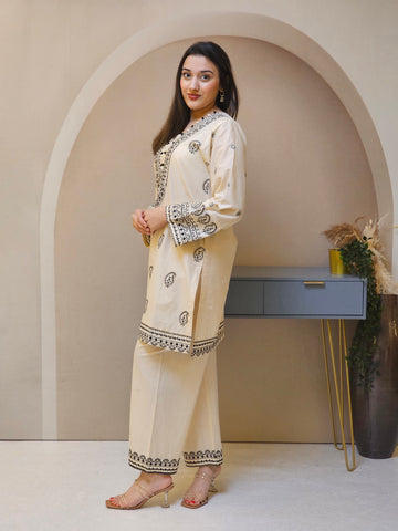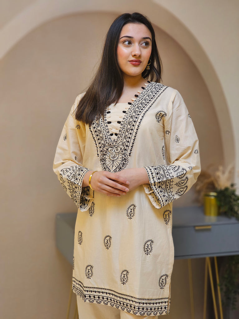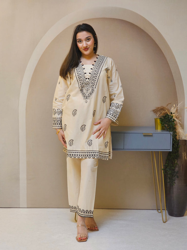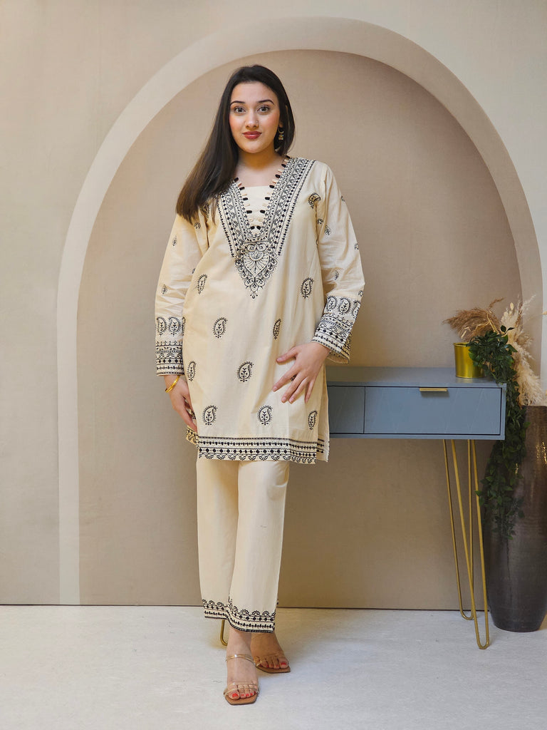2PC Sadah Bahar Cream short kameez in Jacquard. V neckline with black loop piping. Black thread embroidery in paisley designs. Long sleeves with cuff embroidery. Paired with straight trouser with cuff embroidery.