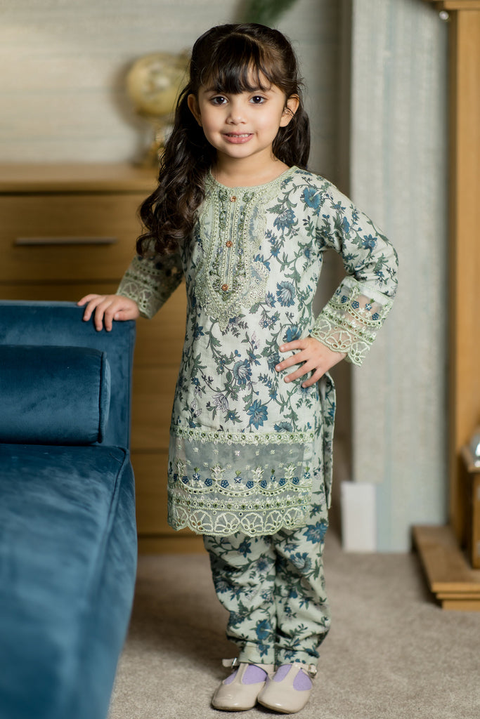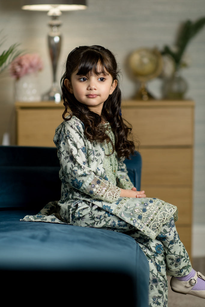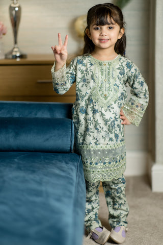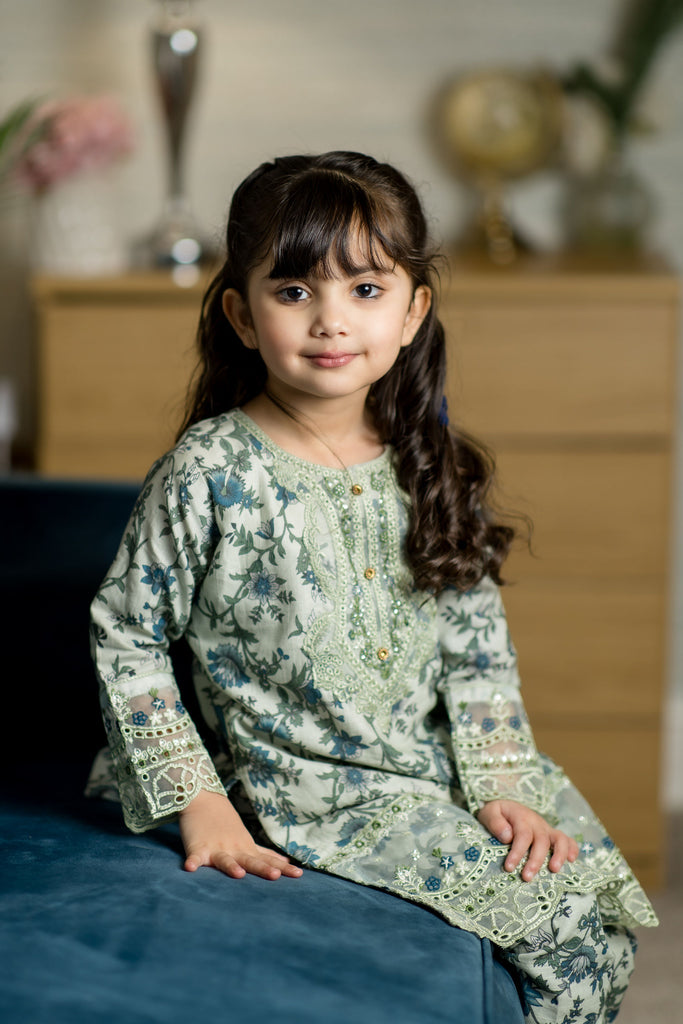 Kids Collection. 2PC Mint in Jacquard with teal and green floral prints. Round neckline mint lace patchwork embroidery with gold buttons. Cuff lace embroidery and border organza lace embroidery. Paired with printed trousers.