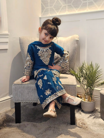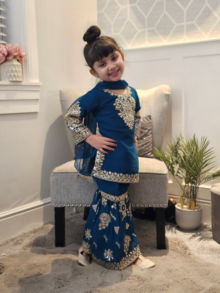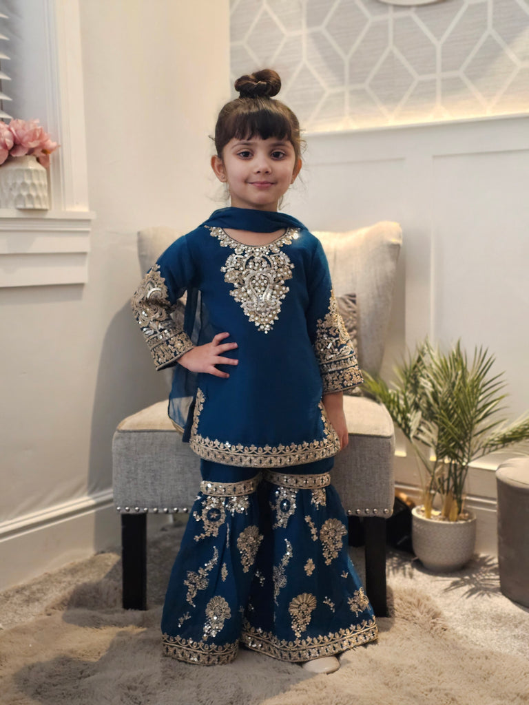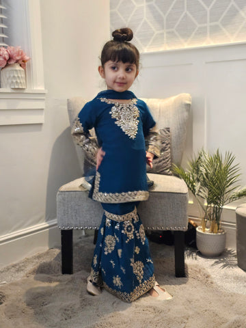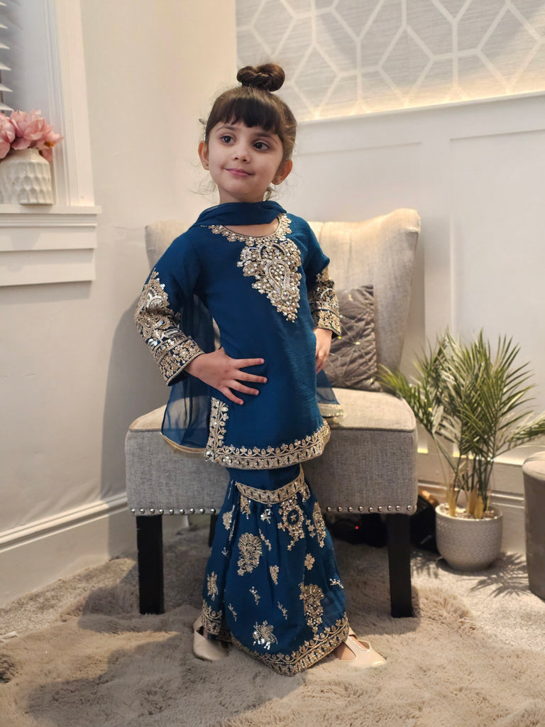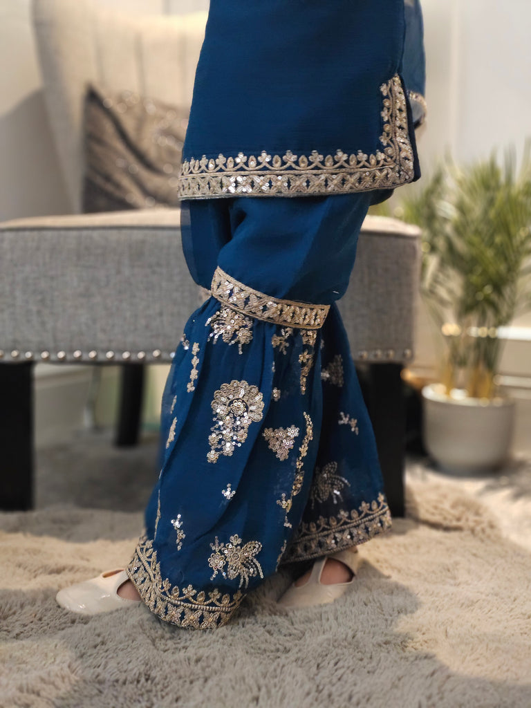 Teal chiffon . With gold dhaman floral embroidery work, accented with matt gold sequence. Round neckline with detail embroidery. Paired with a ghara , dhaman floral embroidery. Teal chiffon dupatta with gold fringe tassel.