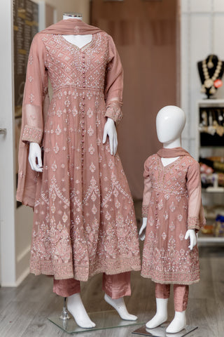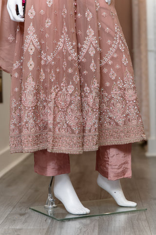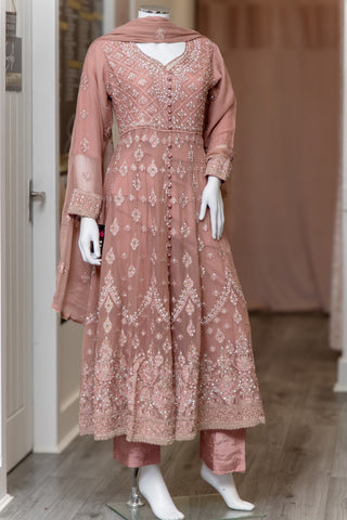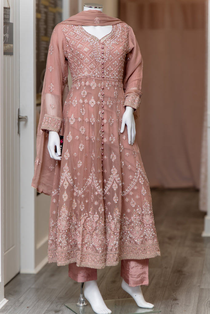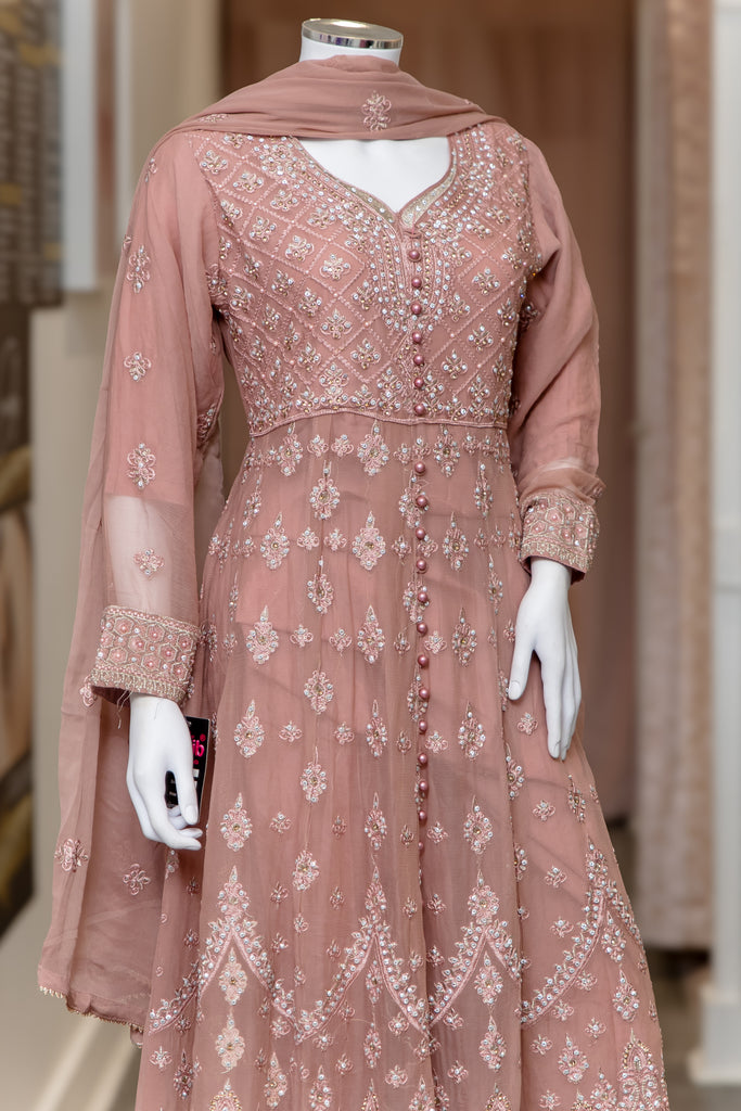Dusky Pink A-line maxi frock. Sweetheart neckline with stone and thread detail embroidery. Buttons on the bodice. Paisley and floral thread embroidery on the flare of dress. Paired with plain silk trousers. Chiffon embroidery paisley design throughout the dupatta.