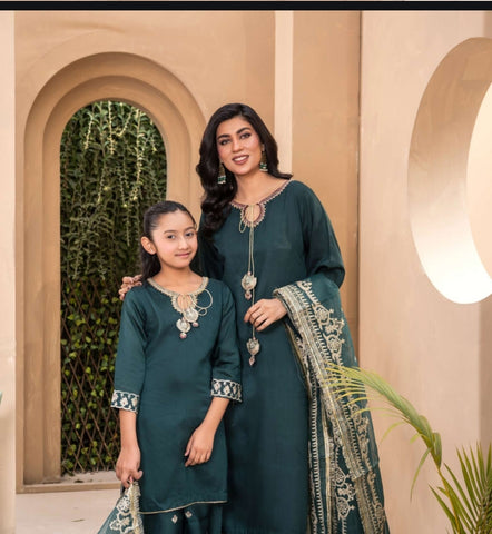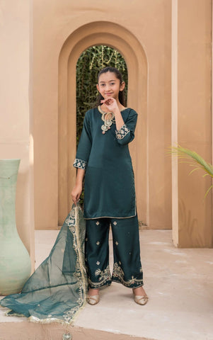 Daughter Charizma Collection. Viscose Silk dark green long kameez. Round neckline with embroidery and beading embellishments, finished with red piping. Gold tassel tie, attached with gold embroidery latkhan. Side slit with gold piping. Organza cuff embroidery with gold dhaman work. Paired with wide leg plazzo trousers with gold floral thread embroidery with red and pink floral piping throughout. Green organza dupatta with gold floral embroidery and fringe tassel border.