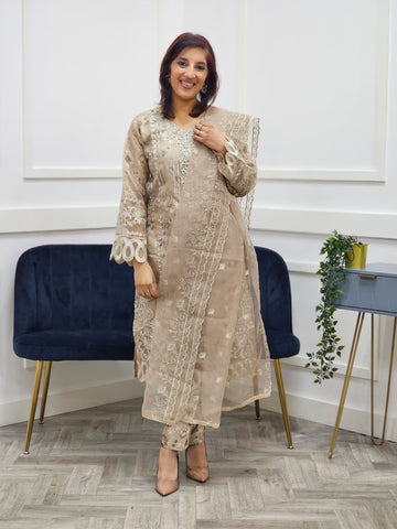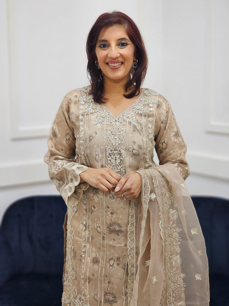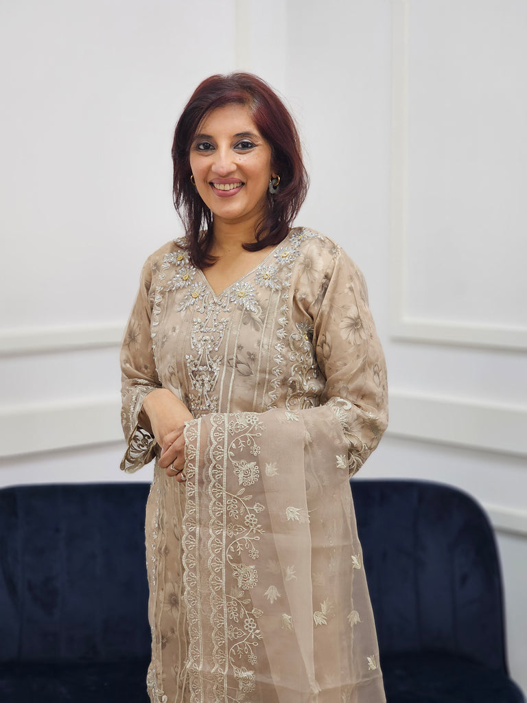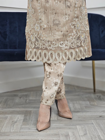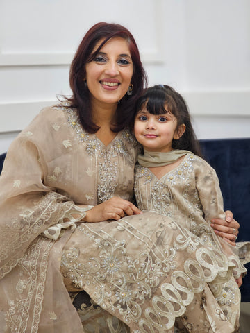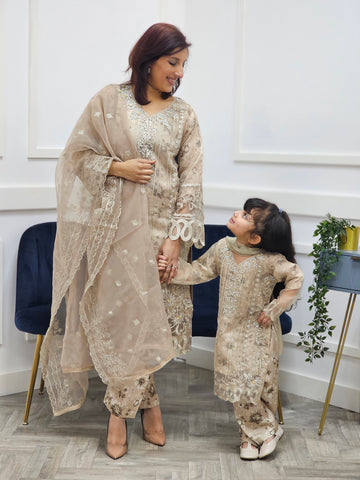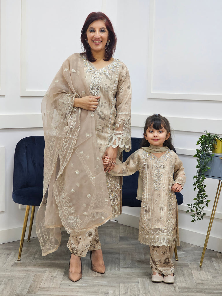 Mother/Daughter Elsa collection. Soft gold organza lined digital printed floral design in gold. Sweetheart neckline detailed with stone work and floral thread embroidery. Side panels full floral embroidery design. Paired with silk digital floral printed trousers. Finished with a soft organza scallop piping floral thread border.