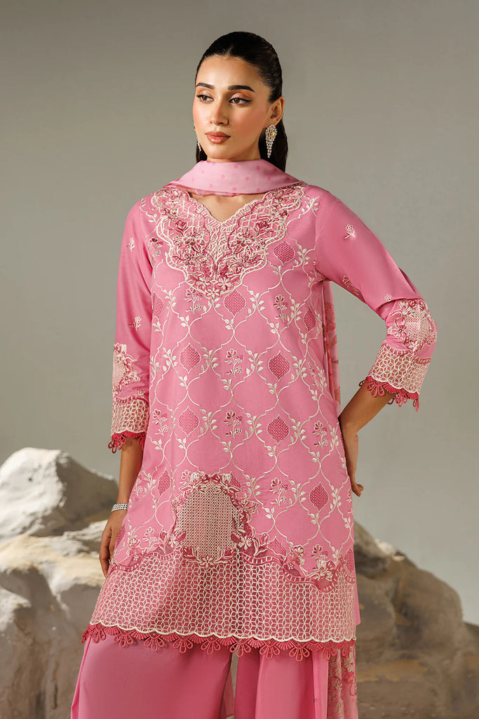 Pink short kmaeez in lawn. High V neckline with white and pink floral thread embroidery. 3/4 sleeves with embroidery and pink lace piping. Floral embroidery on the border of kameez. Paired with farshi shalwar. Digital floral printed pink silk dupatta.