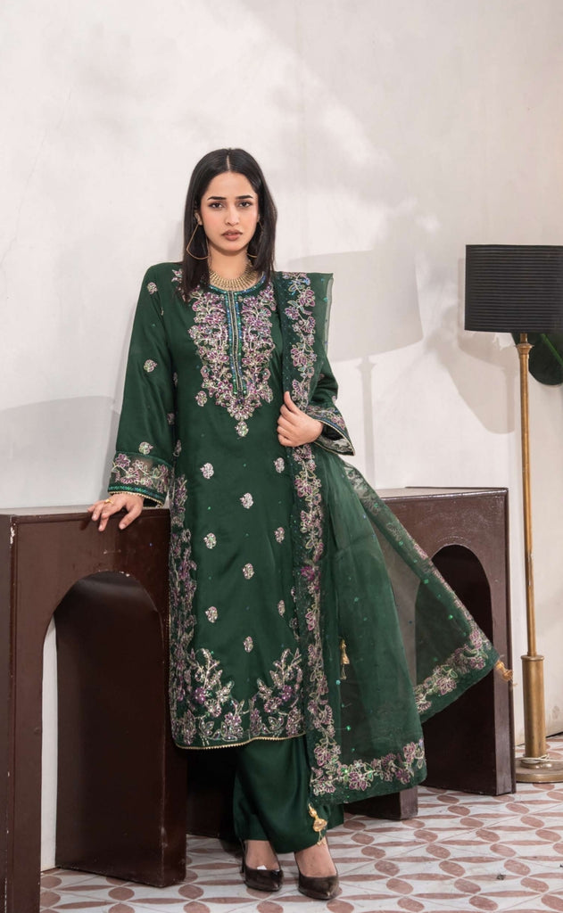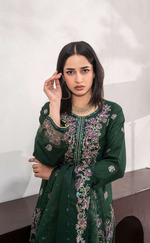 Forest green linen floral thread embroidery long kameez. Contrasted with raspberry pink floral thread embroidery throughout. Green sequence and white stone work on the bodice of kameez and green tassel. Round neckline and long sleeves with embroidery. Paired with plain linen plazzos. Complimented with a organza dupatta with floral thread embroidery border piping.