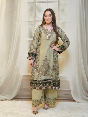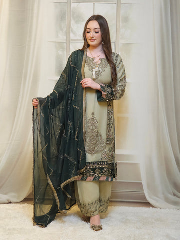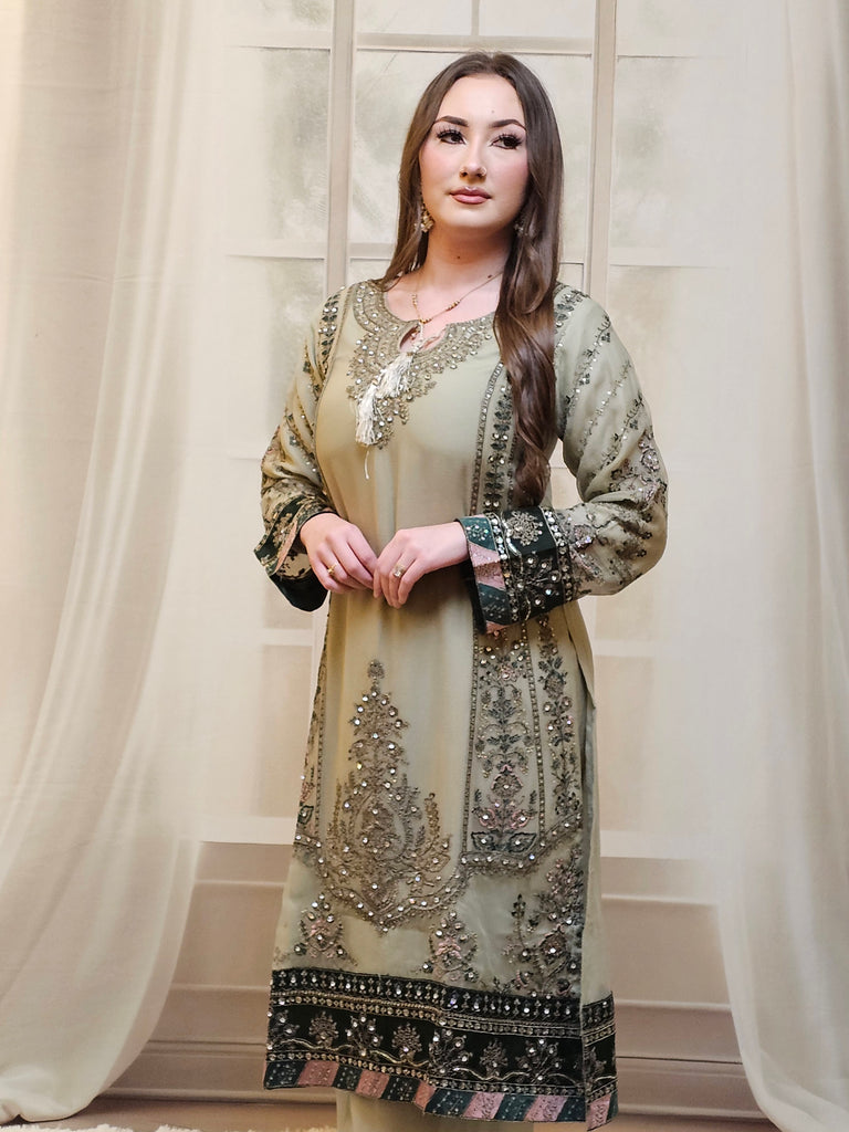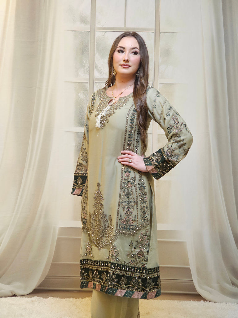 Pistachio long kameez in chiffon. Matt gold dhaman work embroidery. Accented with white stone work. Round neckline with U shape cutout with tie tassels. Accented with dark green leaf thread embroidery on side panels, and hints. of pink floral embroiders. Contrasted of dark green cuff border embroidery. Paired with plazzo , with little floral detail embroidery and bronze stone work. Contrasted with a dark green chiffon dupatta with floral piping and fringe tassel.
