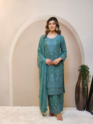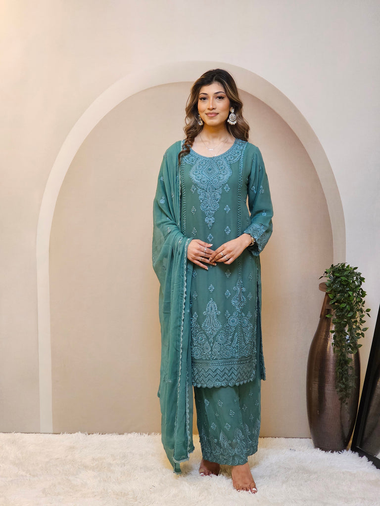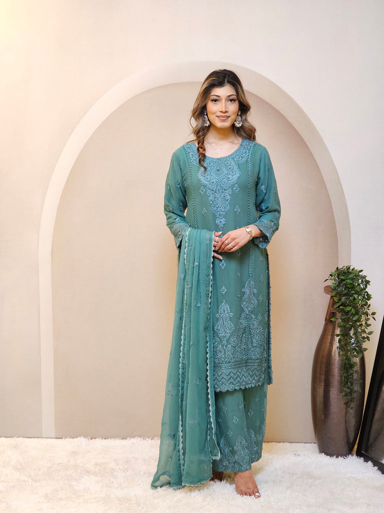 Teal long kameez in chiffon, Round neckline with detailed floral thread accented with pearls. Full embroidery on bodice. Paired with embroidery plazzo trousers. Chiffon dupatta with lace piping and embroidery.