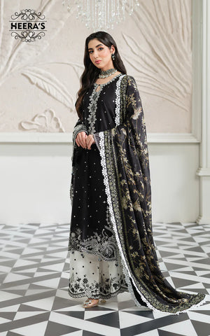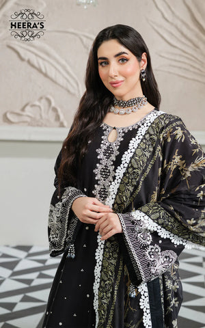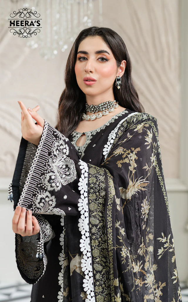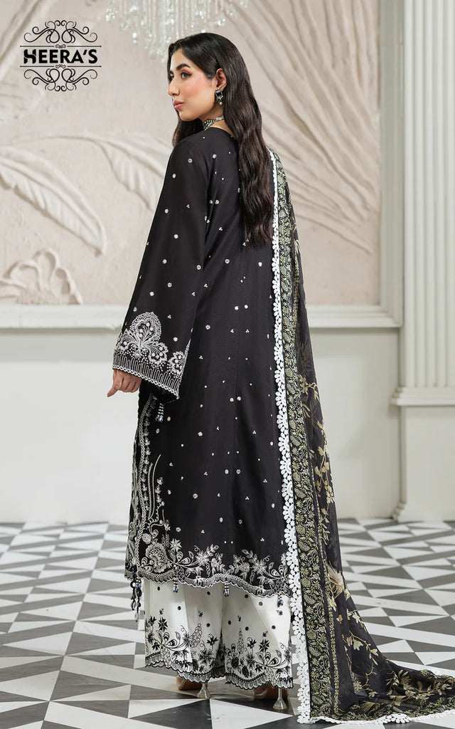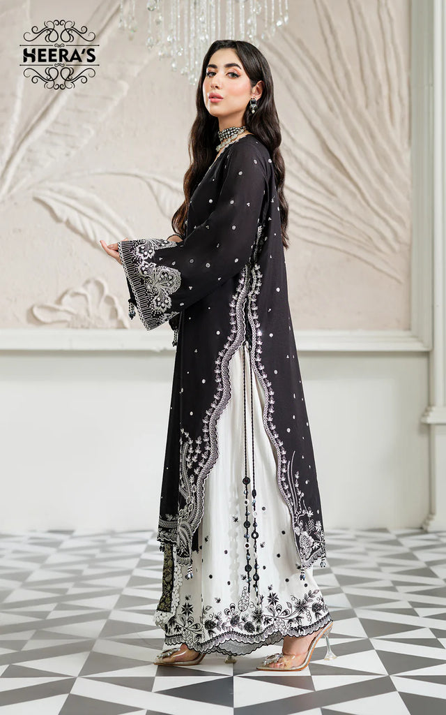 Black long kameez in viscose. With white floral prints, detail white thread embroidery on round neckline. Bell sleeves with cutwork detail embroidery, and on bottom border of kameez. Side panel slits with black/white tassels ties. Paired with white plazzo cutwork embroidery with black floral designs. Complimented with floral digital printed silk dupatta with lace piping.
