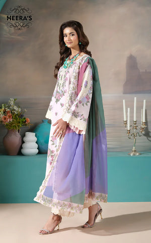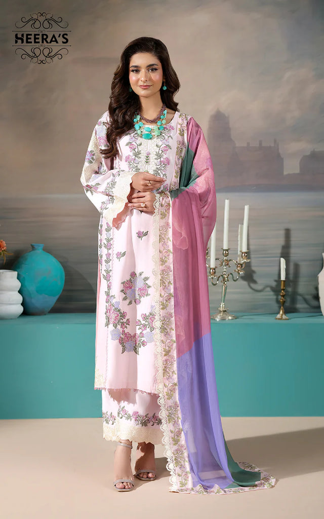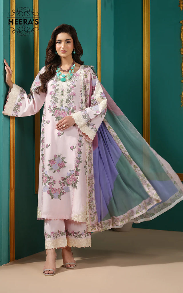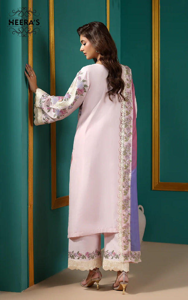 Blush pink long kameez. Beautiful crossed stitch pastel floral thread embroidery. Bell sleeves with embroidery with a wide lace border. Round neckline detailed embrodiery and tassel beading on bodice. Paired with plazzo trousers with embroidery floral on cuff. Chiffon dupatta in ombre purple & mint green, with border piping.