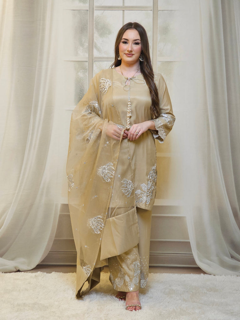Raw Silk Beige short U shape kameez. Round neckline with silver tie with cluster pearl tassels. Embroidery work silver with floral and leaf design embroidery. Accented with silver sequence. Cutwork piping on cuff with a scallop design. Paired with wide leg trousers with embroidery. Soft organza dupatta with floral embroidery throughout.