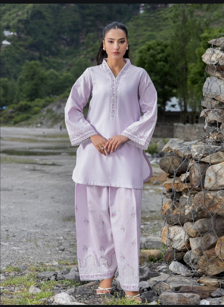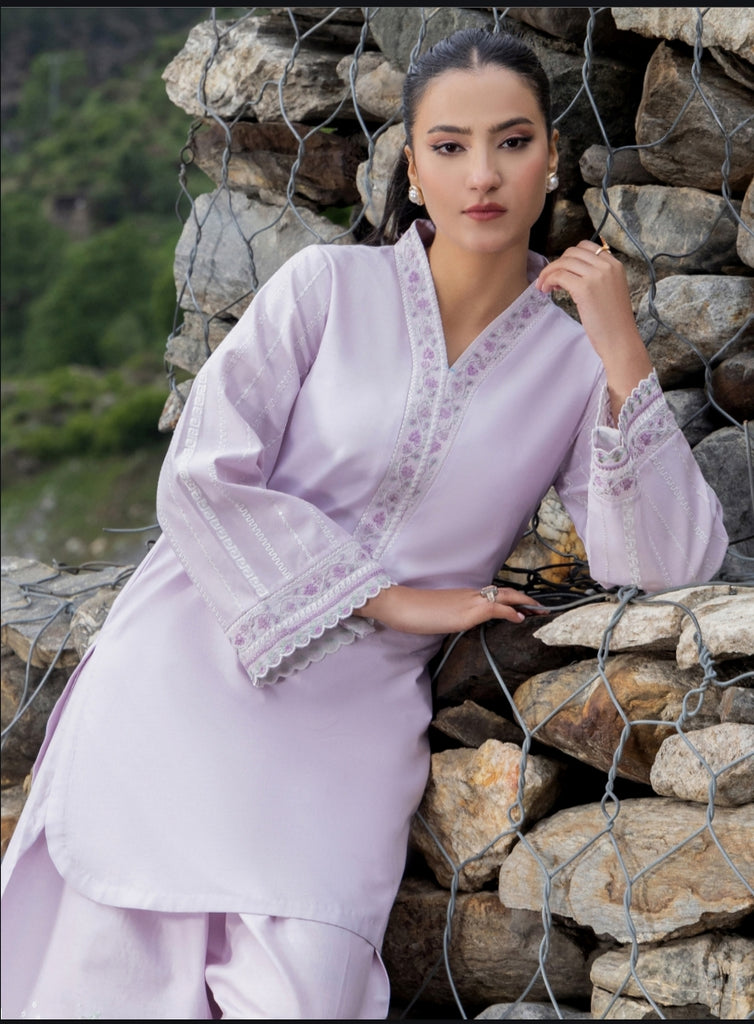 2PC Lilac lawn, with light purple floral thread embroidery. V neckline embroidery piping. Bell sleeves, paired with farshi shalwar with floral embroidery throughout.