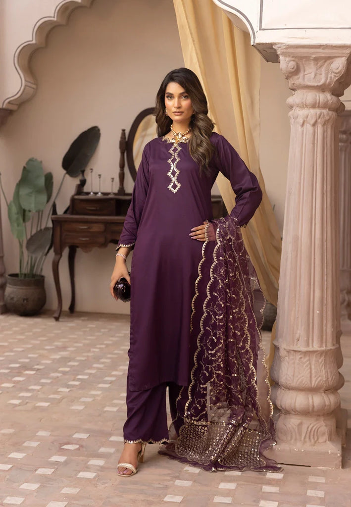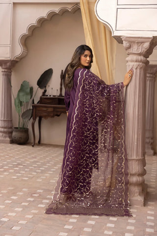 Get ready with your Dholki outfit! Viscose silk in deep purple Long kameez with a round neckline. Gold dhaman embroidery. 3/4 sleeves with a scallop embroidery piping. Paired with plain wide leg plazzo trousers. Finished with a organza purple dupatta with gold sequence embroidery.