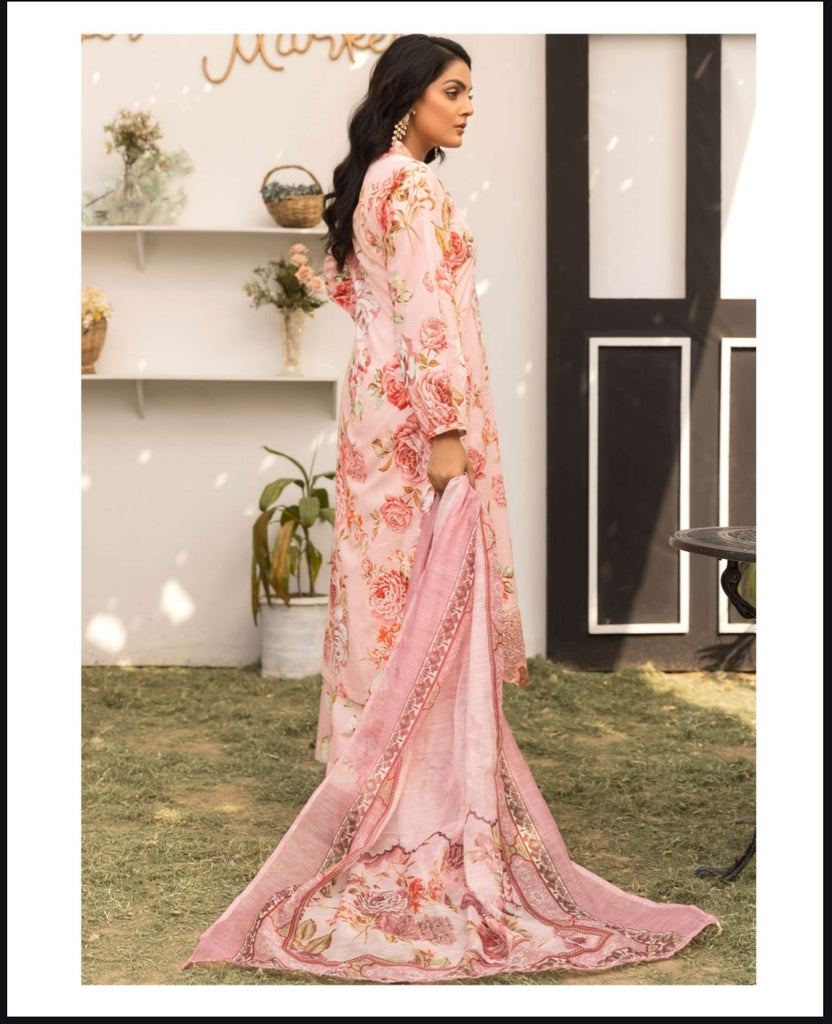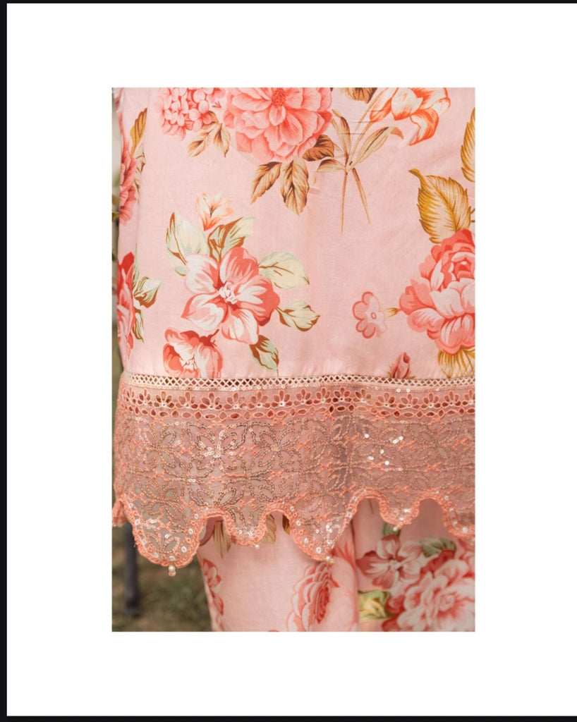 Pink lawn long kameez, with pink floral prints. V neckline with lace embroidery piping. Lace embroidery border on the bottom of kameez. Paired with wide leg floral printed trousers. Floral pink net dupatta.