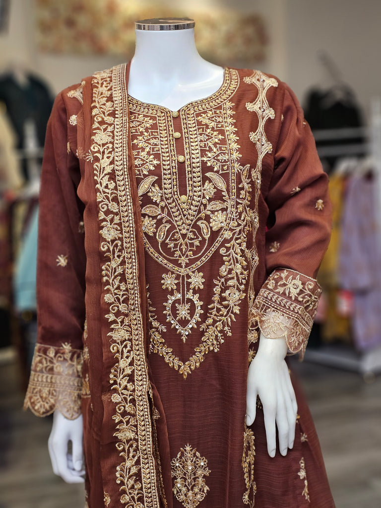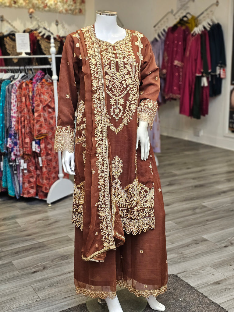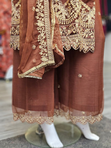 Brown and gold dhaman embroidery. Round neckline with gold dhaman and stonework embroidery, throughout kameez. Embroidery on sleeves and cuff. Paired with wide leg plazzo trousers. Finished with a brown chiffon gold embroidery piping on dupatta.