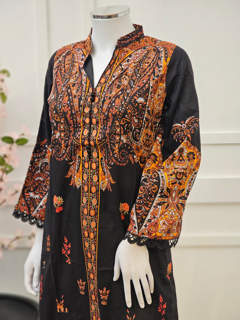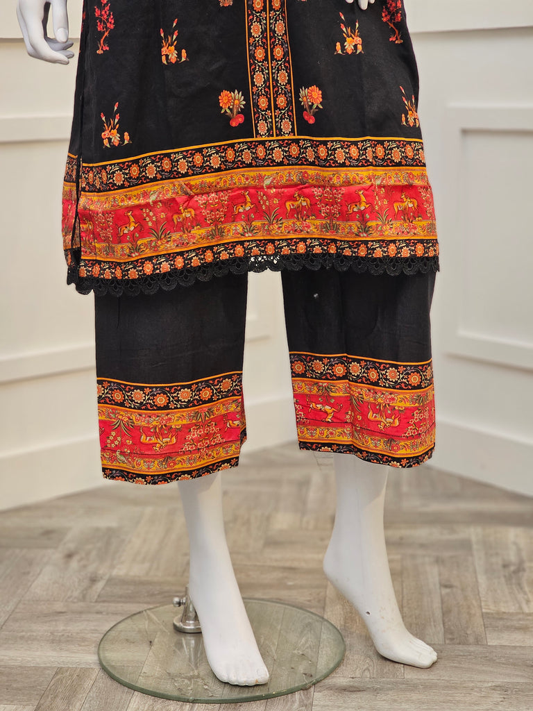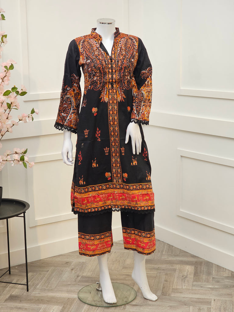2PC Black cotton with orange and red floral prints. Crew collar neckline. Paired with black wide leg trousers with orange cuff prints.