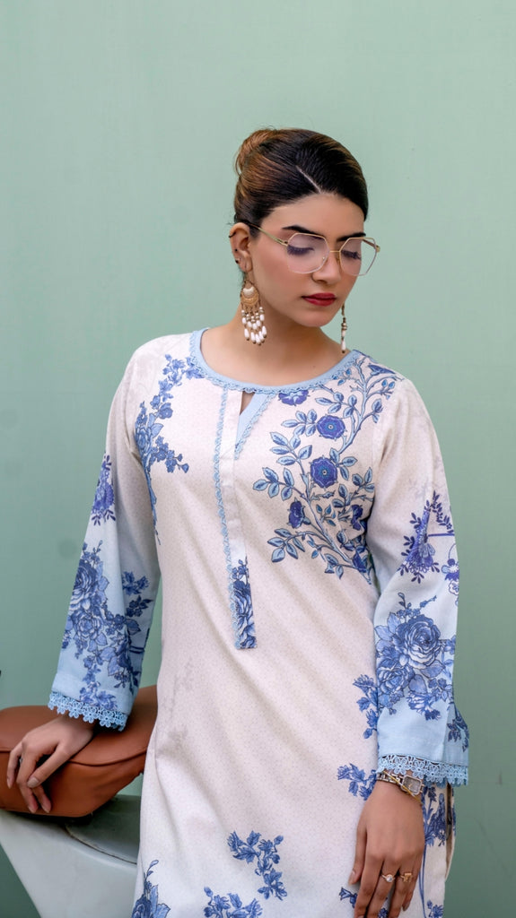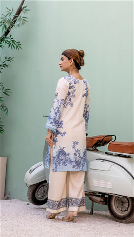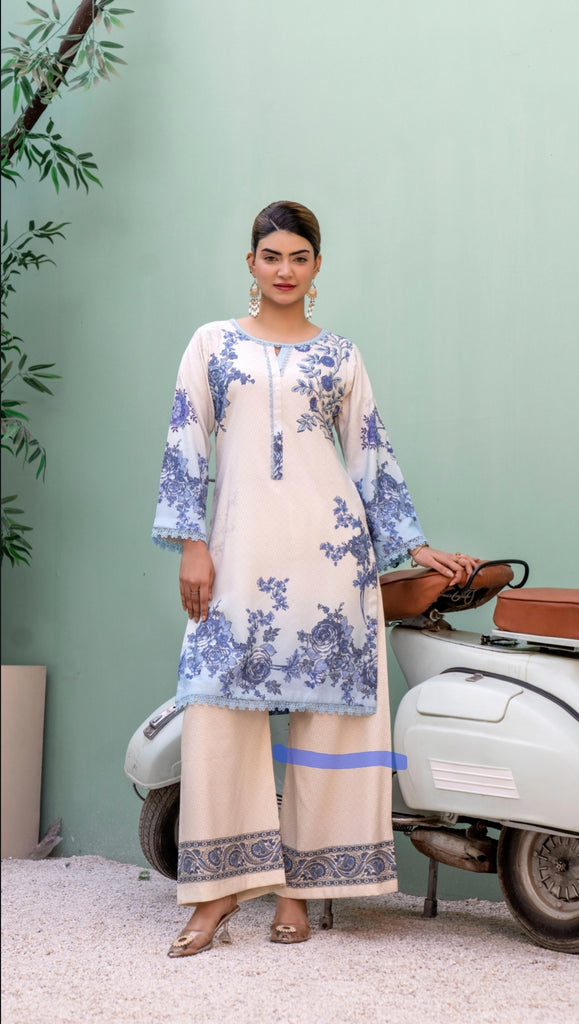 2PC Dhanak. Cream with light blue, digital floral prints. Round neckline blue piping and lace. Sllight V cutout. Printed sleeves, paired with wide leg plazzo with cuff prints.