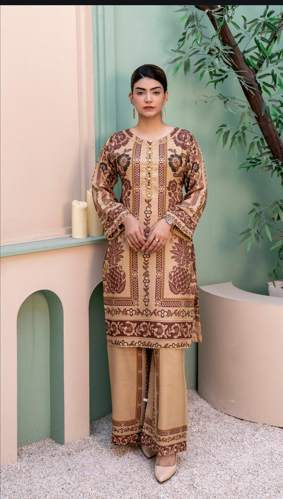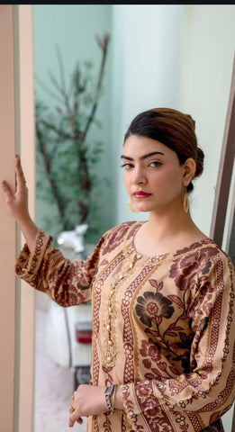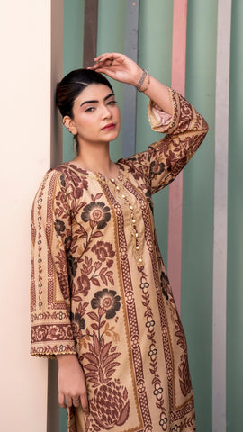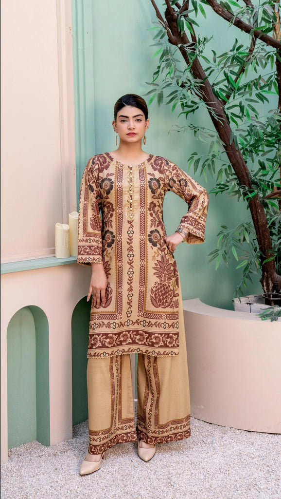 2PC Dhanak. Tan contrasted with brown and black floral prints. Round neckline with lace piping and gold buttons. Printed sleeves, paired with printed plazzo.