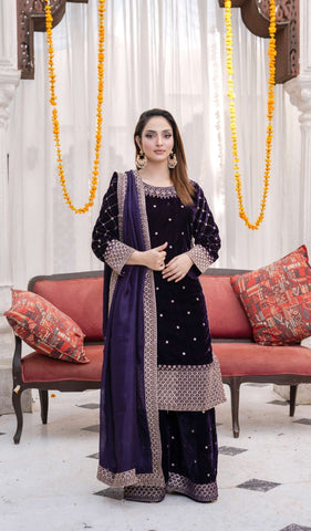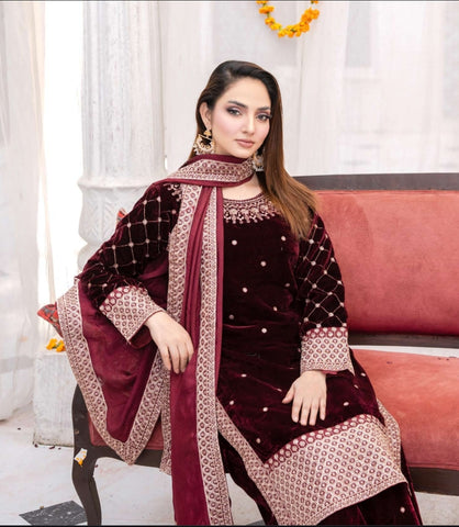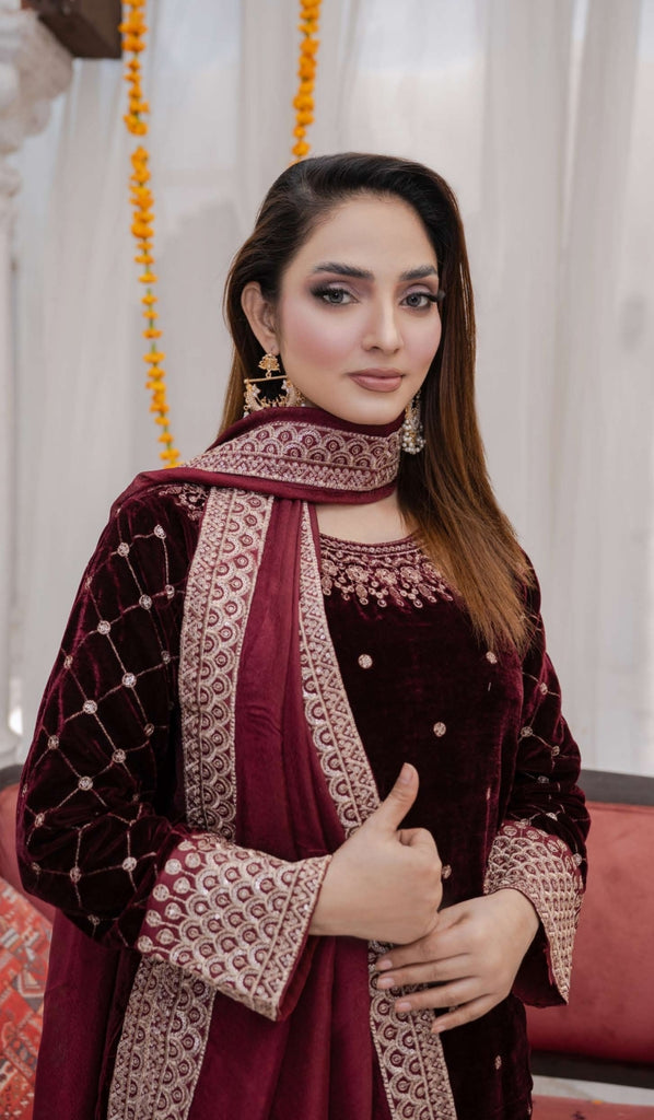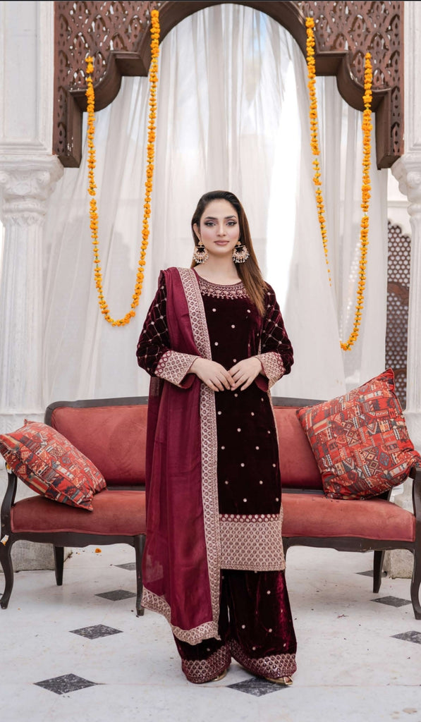 Maroon Micro Velvet. Long kameez with gold dhaman embroidery. Round neckline detail embroidery. Gold thread with embroidery. Wide border dhaman border on the bottom of kameez, long sleeves, with cuff. Paired with wide leg plazzo border piping. Chiffon dupatta with border piping.
