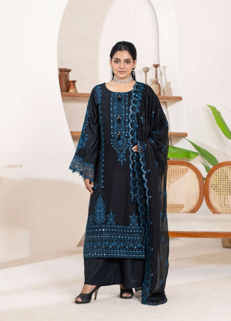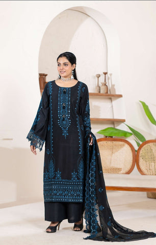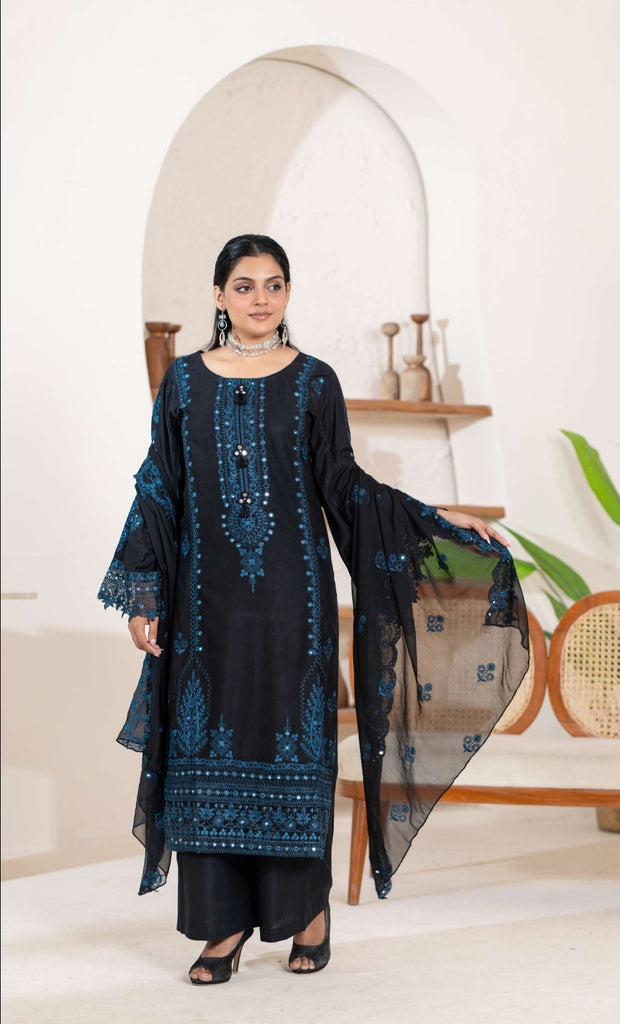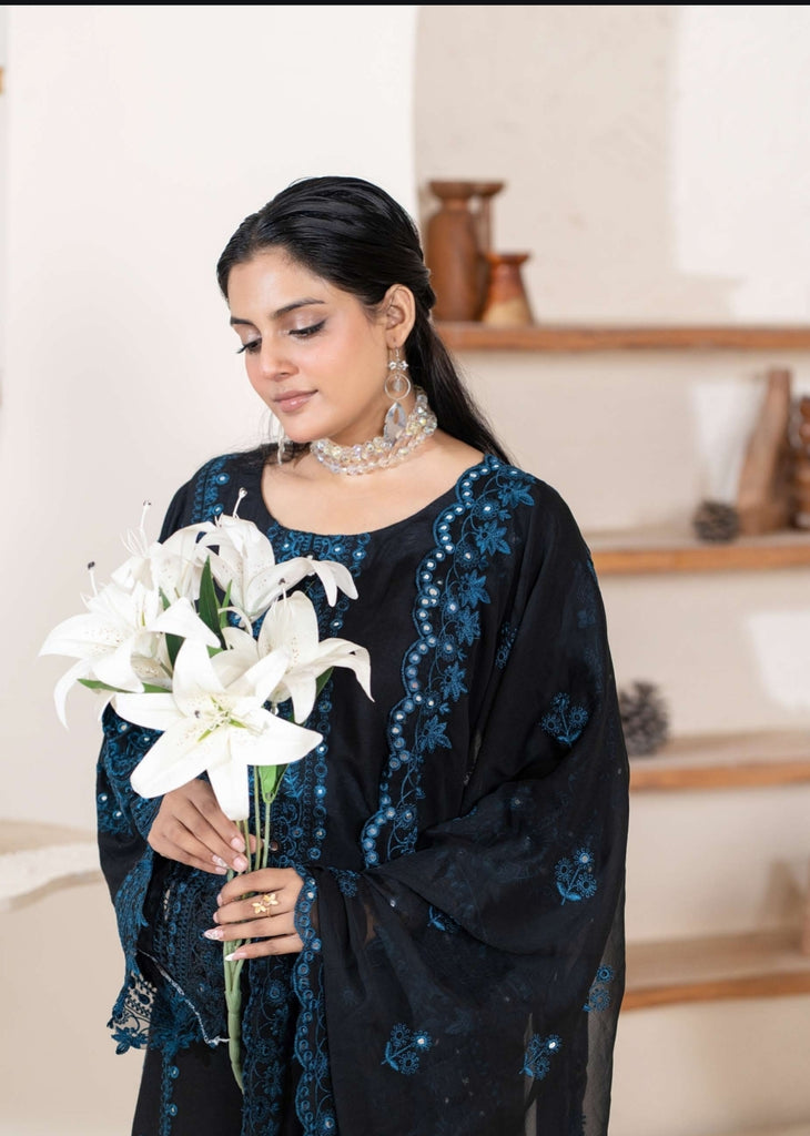 Black linen long kameez. Contrasted with turquoise floral thread embroidery. Accented with mirror embroidery and beaded tassels, on round neckline. Elegant bell sleeves with embroidery. Paired with plain black plazzo trousers. Chiffon dupatta with turquoise floral thread embroidery piping.