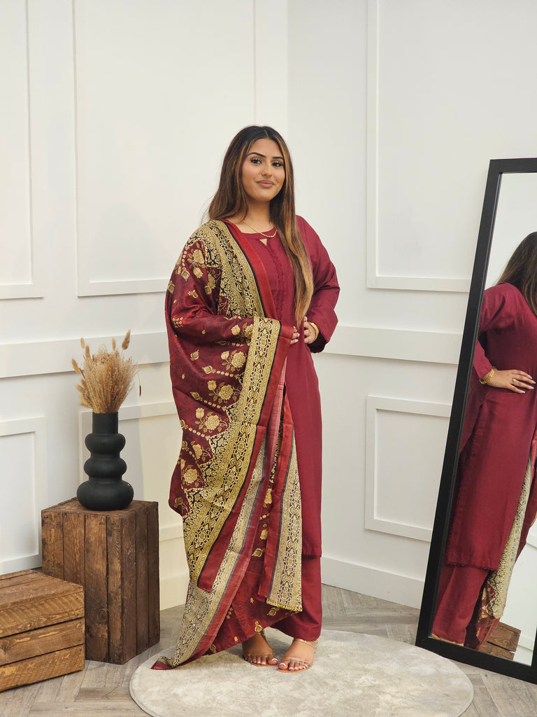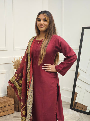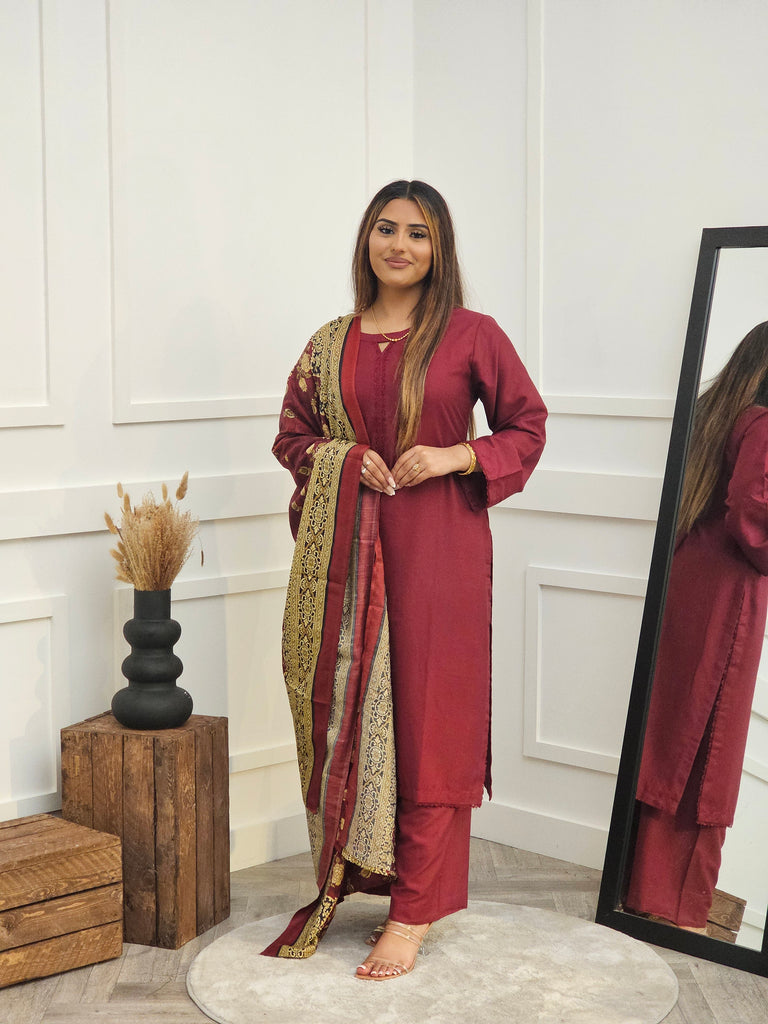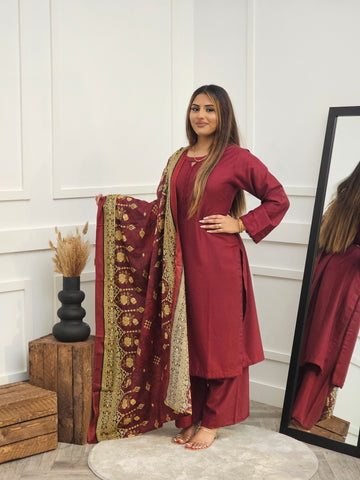 3PC Magenta dhanak. Round neckline with lace piping with a V cutout. Lace piping on side panels of kameez and cuff lace piping. Paired with plain dhanak wide leg trousers. Shawl printed dupatta with magenta and matt gold floral prints.
