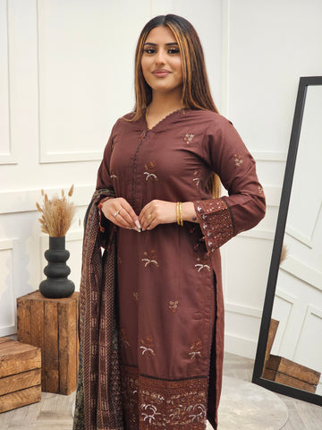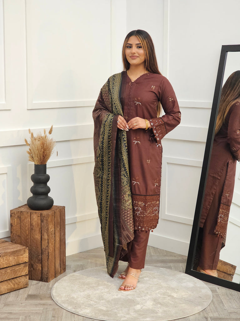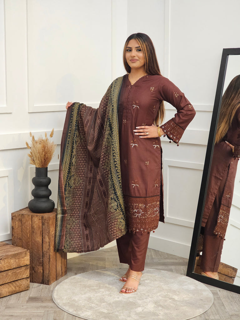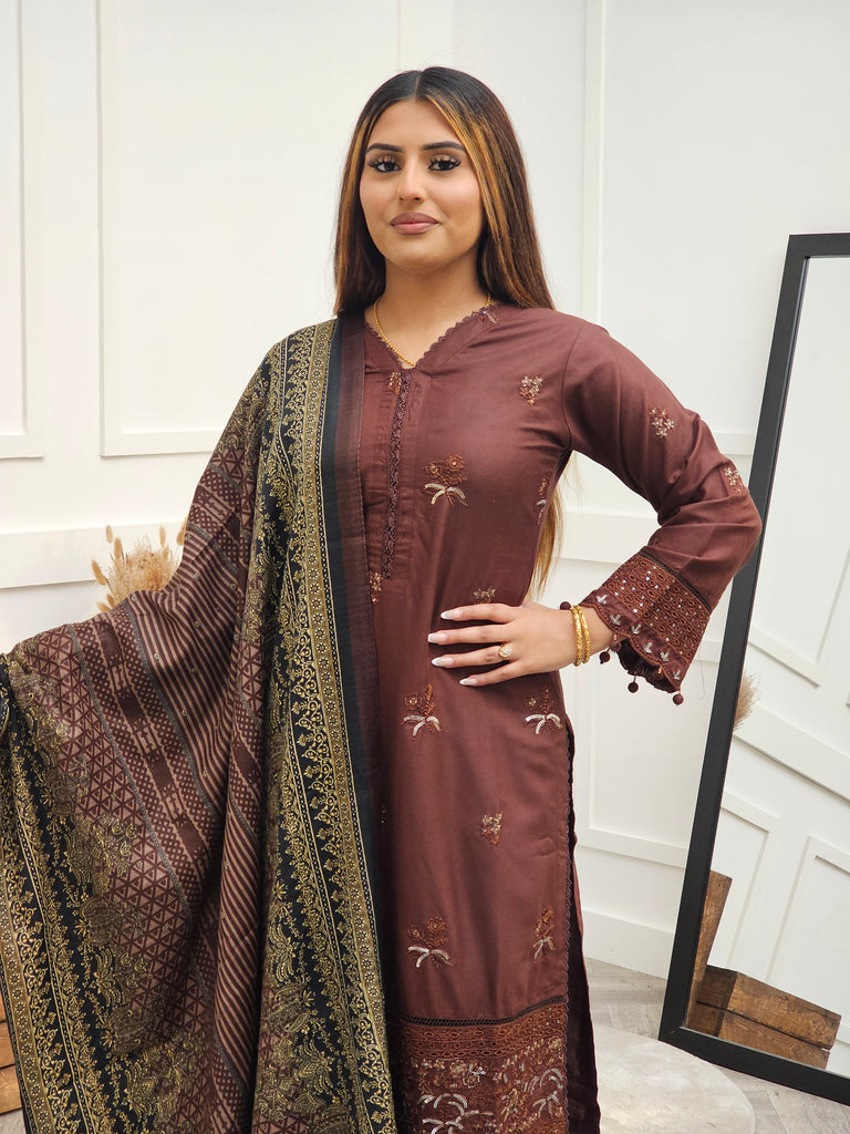 Brown dhanak with floral thread embroidery, accented with sequence. V neckline with lace piping. Bottom embroidery with gold sequence embroidery and floral designs. Cutwork piping on the border and on the cuff of sleeves. Paired with plain trousers. Printed shawl dupatta contrasted with brown and black floral prints.