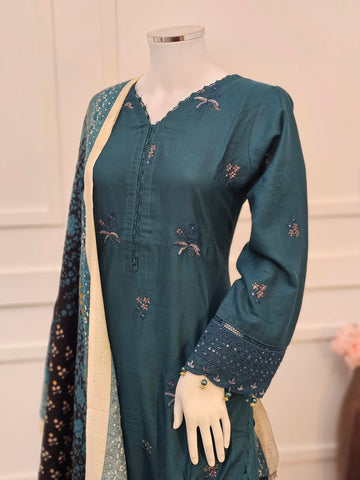 Teal dhanak with floral thread embroidery, accented with sequence. V neckline with lace piping. Bottom embroidery with gold sequence embroidery and floral designs. Cutwork piping on the border and on the cuff of sleeves. Paired with plain trousers. Printed shawl dupatta contrasted with teal, black floral prints.