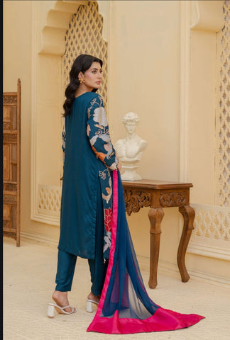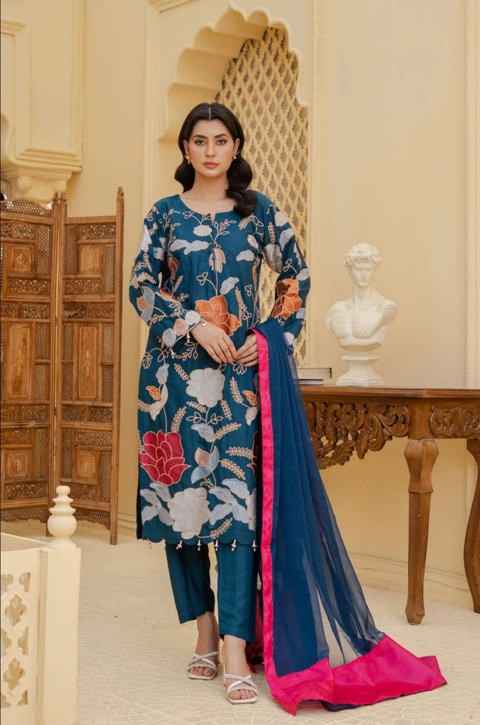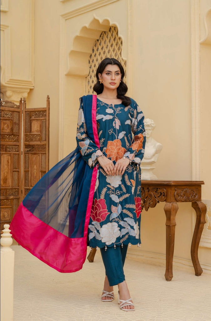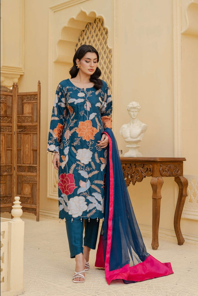 Teal long kameez. With cross stitch embroidery, with orange,pastel blue, pinks all floral designs, accented with gold piping. Round neckline with buttons on bodice. Silver jewell tassel beading. Paired with plain silk trousers. Chiffon green dupatta, contrasted with hot pink wide border.