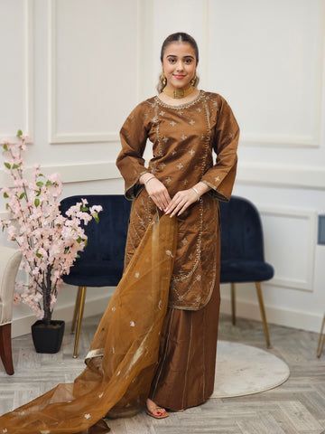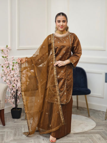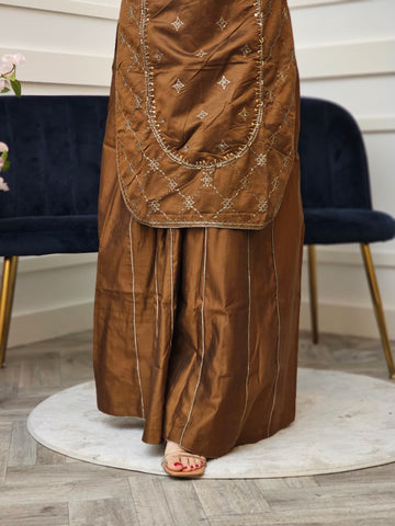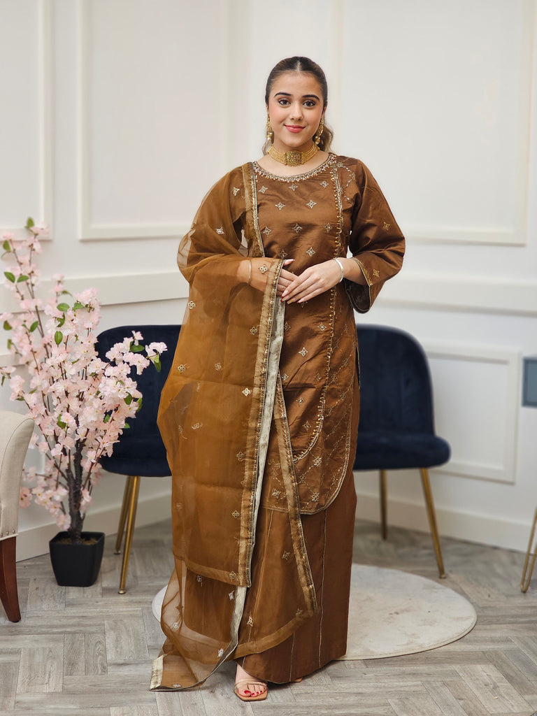 Viscose Silk in Copper. U shape cut kameez with matt gold thread embroidery. Round neckline with jewell beading embellishments. Paired with wide plazzo  leg trousers, with gold piping panels. Finished with a organza copper dupatta with gold floral embroidery.