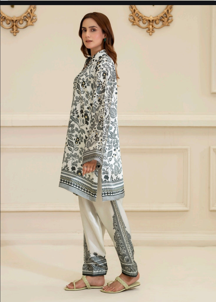 2PC Silk Short Kurta in pale mint. Contrasted with dark green digital floral print. Collar neckline. Paired with trousers with digital prints on the side panel of trousers.